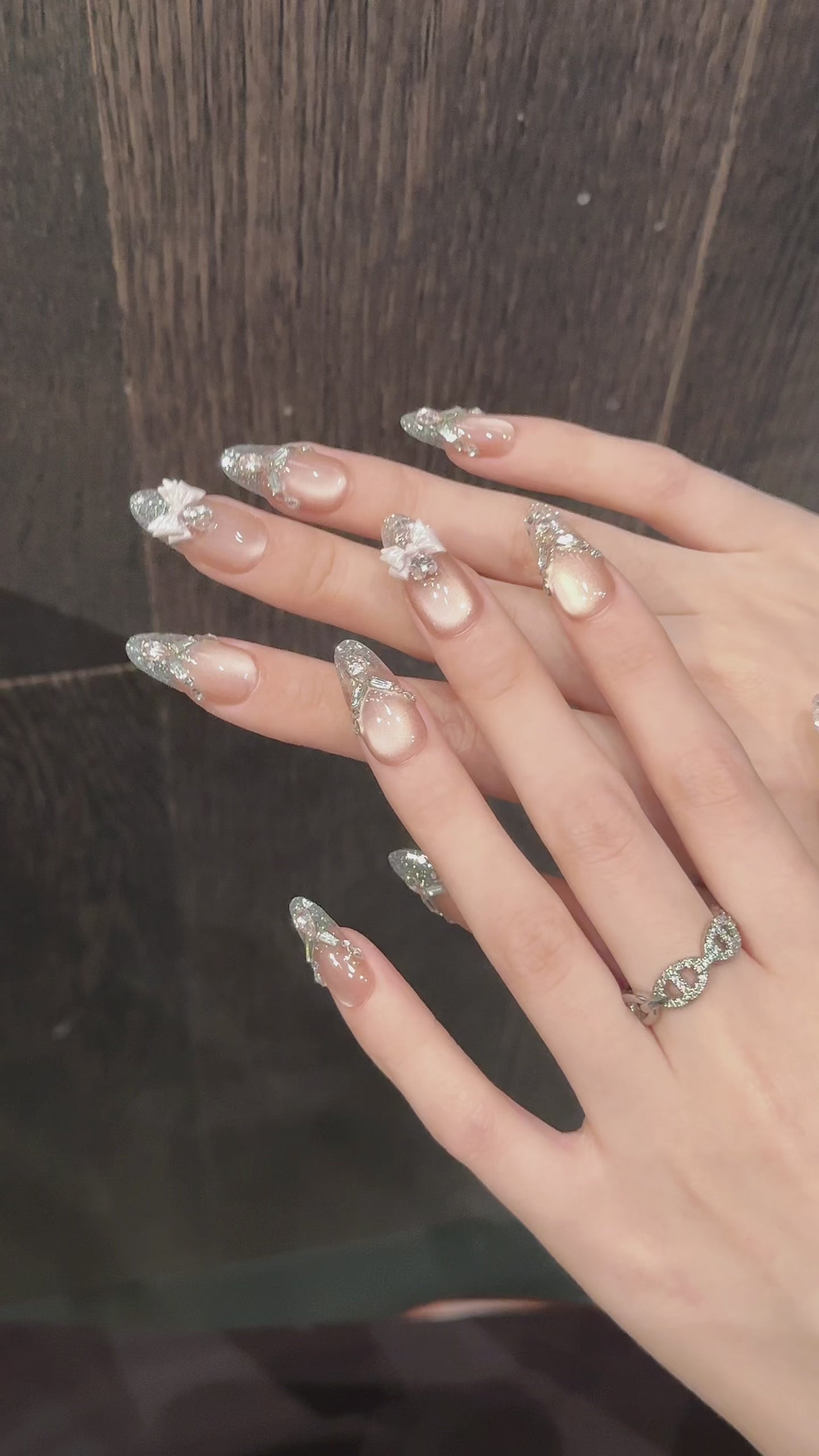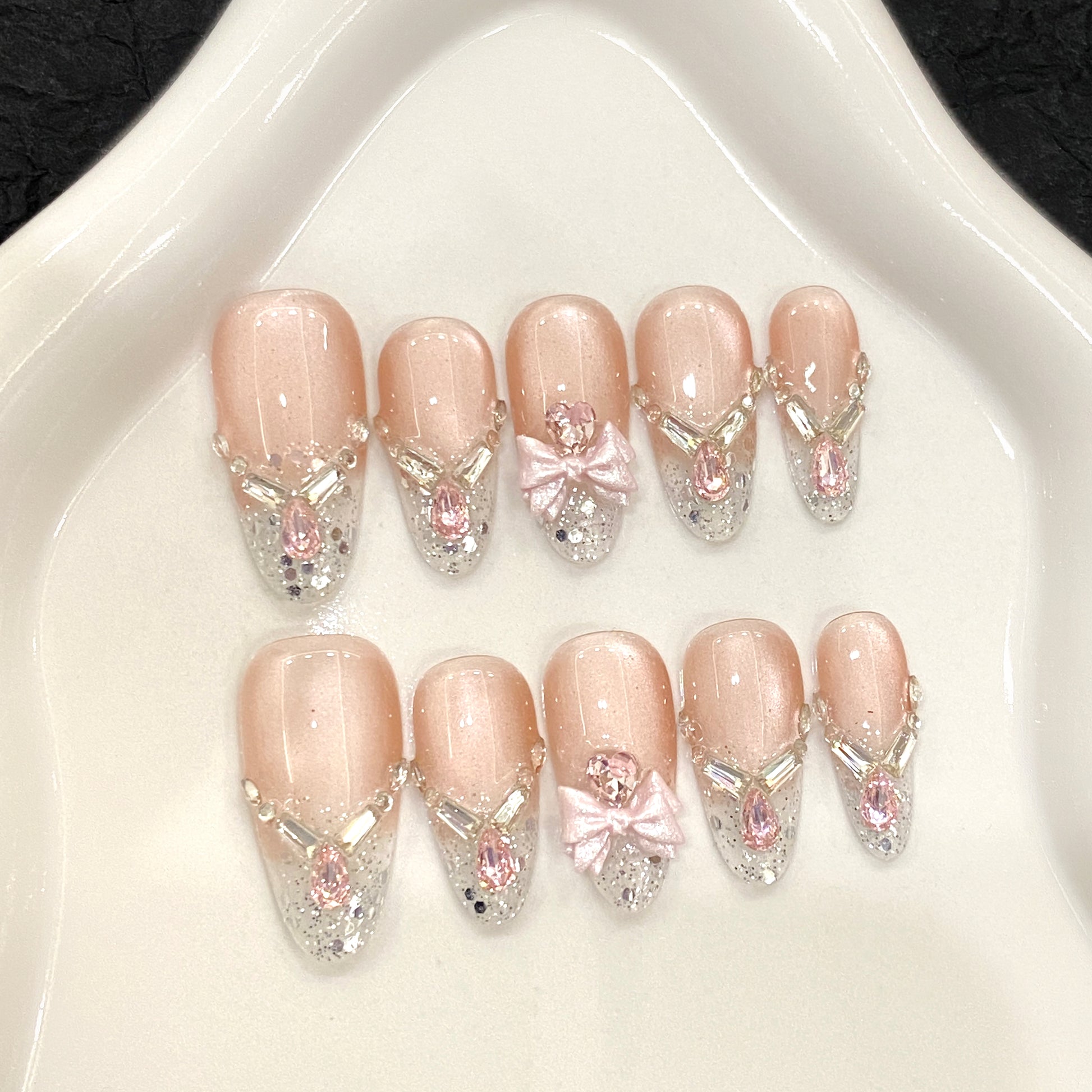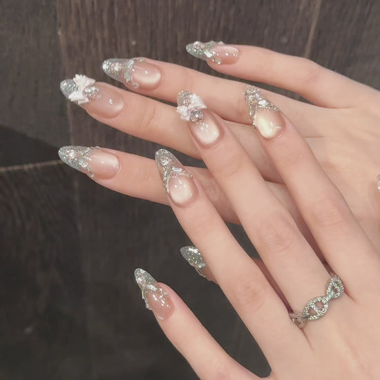 Elevate your fingertips with Blush Royale, a luxurious press-on nail set that blends soft romance with regal sparkle. Featuring a nude pink-to-clear gradient base, each nail is adorned with silver glitter, symmetrical rhinestone patterns, and standout embellishments like teardrop gems and satin bows. This set is designed for those who love refined glamour—perfect for weddings, galas, or any moment that calls for a little extra shine.