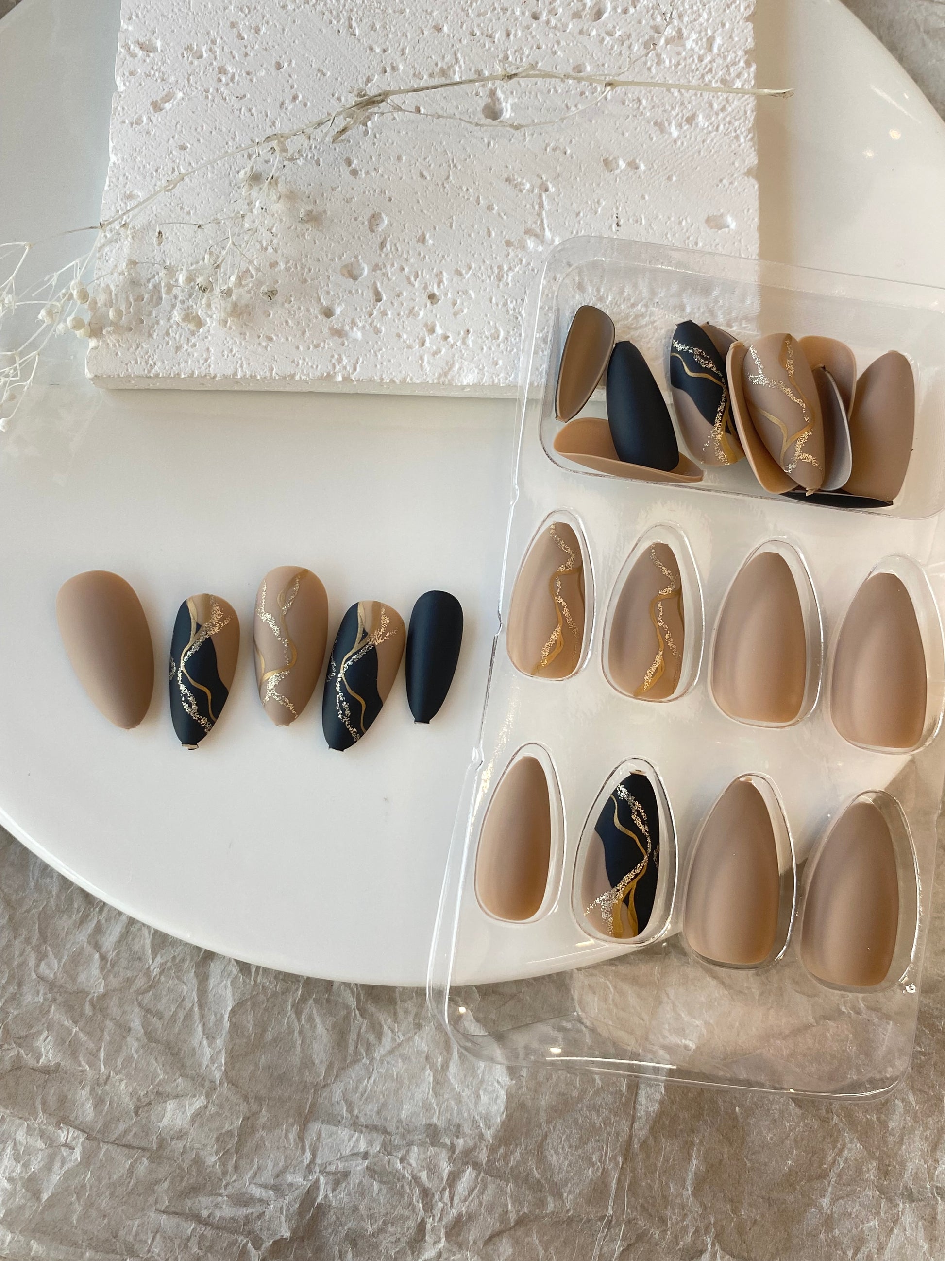 Minimalist meets luxe in Gilded Drift, a press-on nail set that blends earthy tones with metallic artistry. Featuring a trio of matte base colors—navy blue, taupe, and beige—each nail is elevated with flowing gold and silver foil accents that shimmer like liquid metal. The abstract wavy patterns create a sense of movement and sophistication, making this set ideal for modern muses, creative professionals, or anyone who loves understated elegance with a twist.
