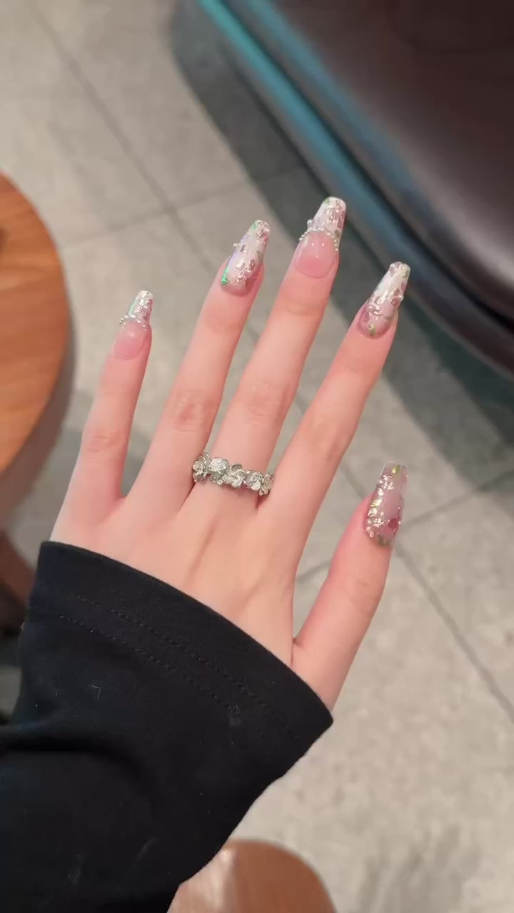 Embrace the elegance of spring with Petal Pearl, a delicate press-on nail set inspired by blooming cherry blossoms. Featuring a soft pink shimmer base, each nail is adorned with dainty floral designs in deep pink and green, accented by a graceful line of white pearls near the cuticle. This set evokes a sense of romance and refinement, perfect for garden parties, bridal looks, or simply adding a touch of nature’s beauty to your everyday style.