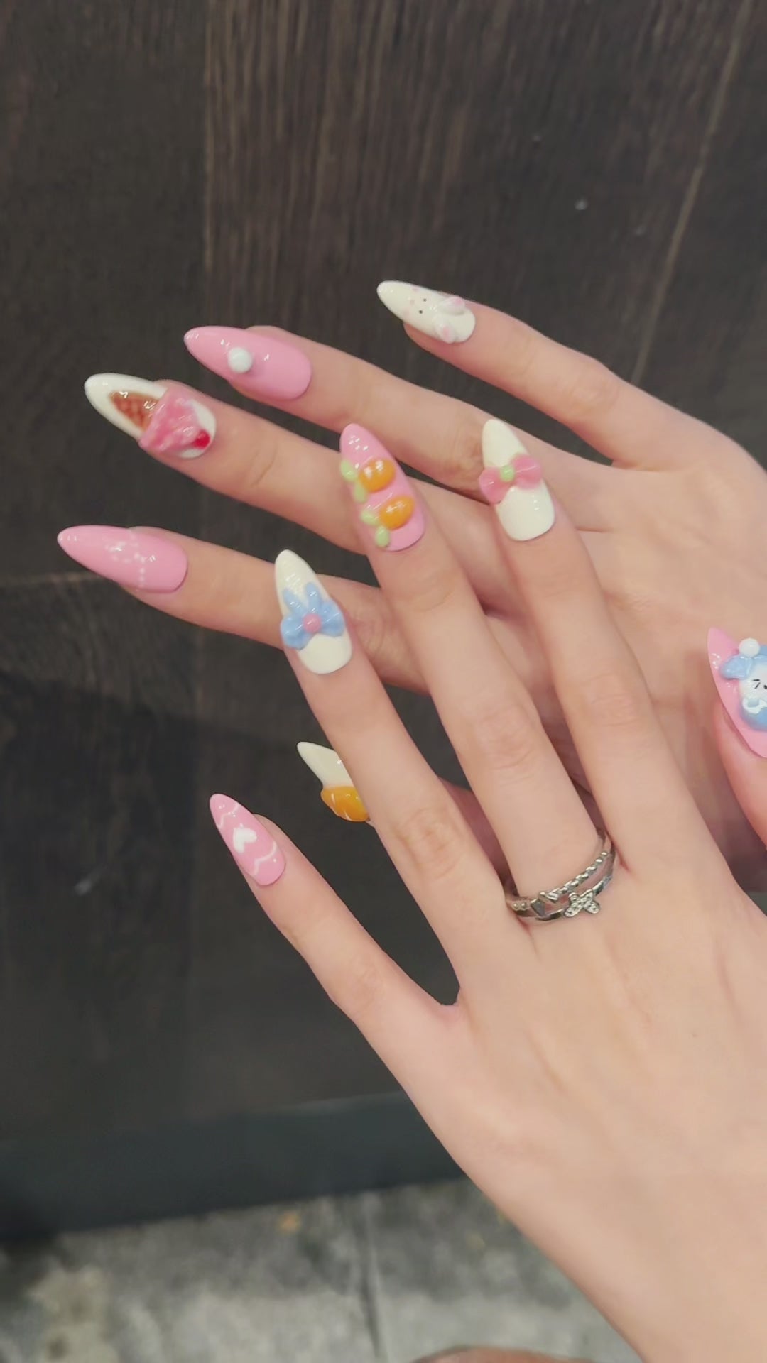 Step into a world of pastel whimsy with Sugar Pop, a press-on nail set bursting with playful charm and vibrant personality. Featuring a delightful mix of 3D embellishments—bunny faces, ice cream cones, carrots, hearts, and flowers—this set is perfect for expressing your fun-loving side. With soft pink, white, orange, and blue tones, each nail is a miniature piece of art designed to make your fingertips pop.